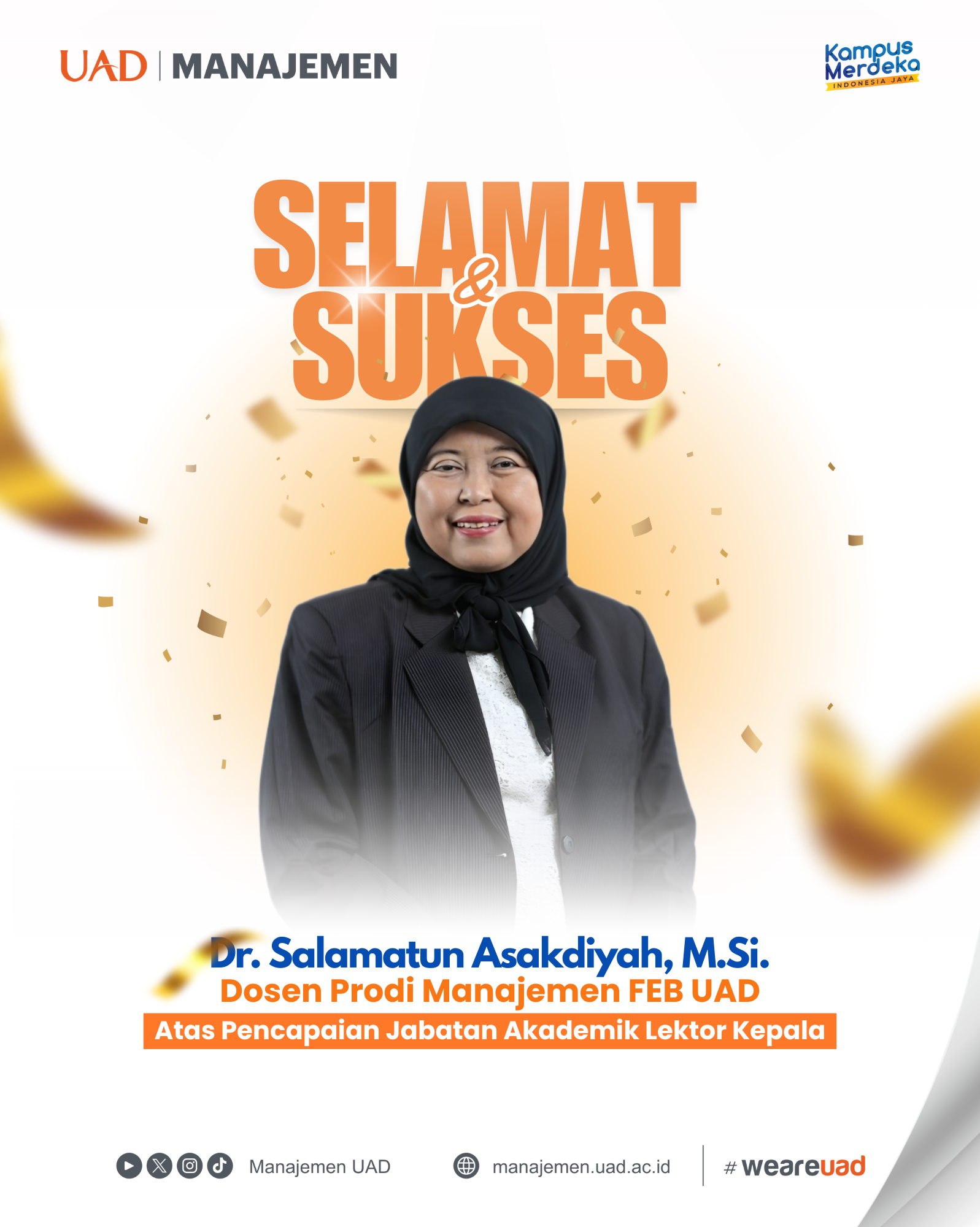Manajemen.uad.ac.id – Program Studi Manajemen Fakultas Ekonomi dan Bisnis (FEB) Universitas Ahmad Dahlan dengan bangga mengucapkan selamat kepada Dr. Salamatun Asakdiyah, M.Si. atas kenaikan jabatan fungsional sebagai Lektor Kepala.